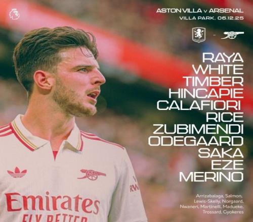 英超第15轮,阿森纳客战阿斯顿维拉,赛前阿森纳首发阵容已经出炉,具体名单如下: 阿森纳首发:拉亚 / 本·怀特、廷伯、因卡皮耶、卡拉菲奥里 / 赖斯、苏维门迪、厄德高 / 萨卡、梅里诺、埃泽